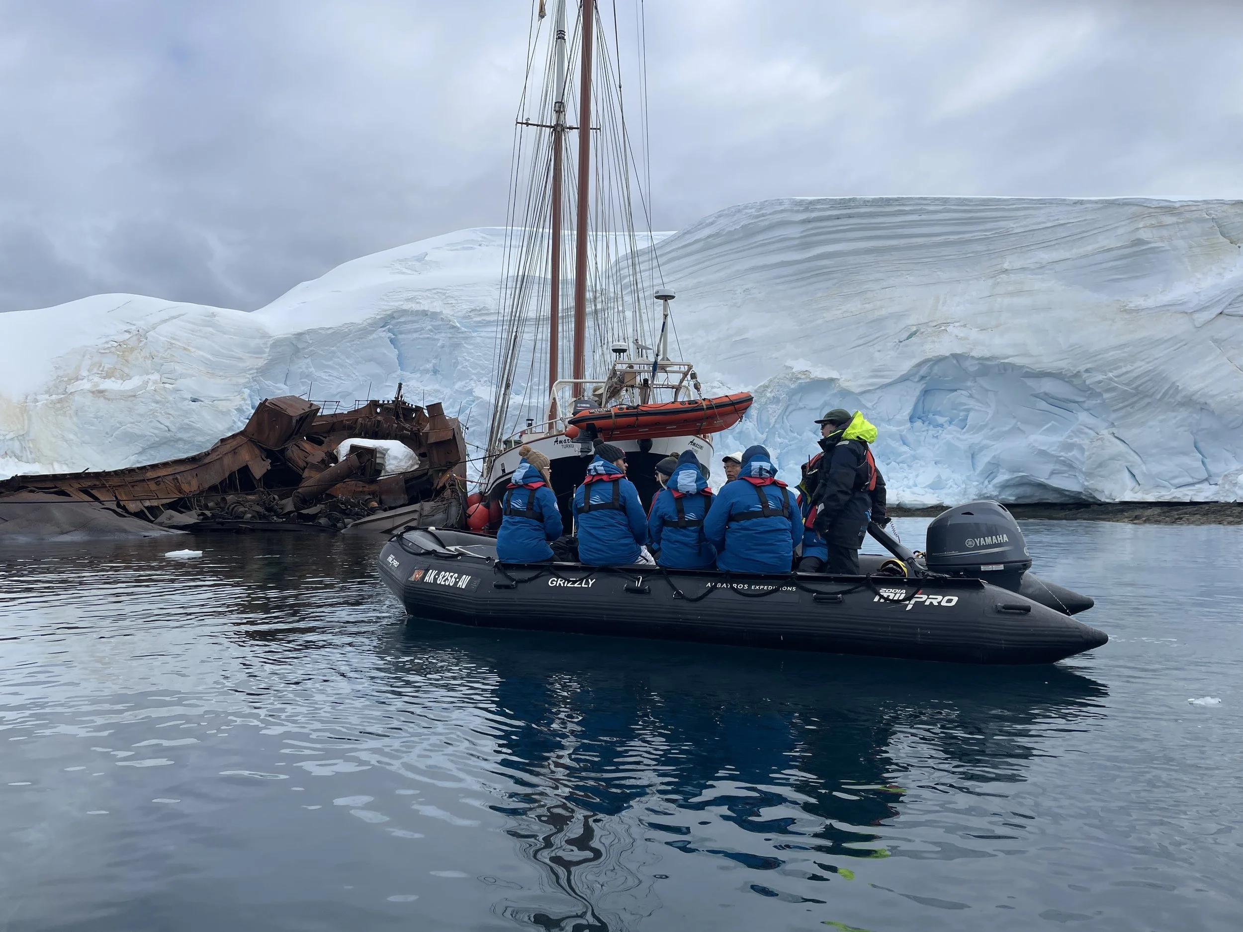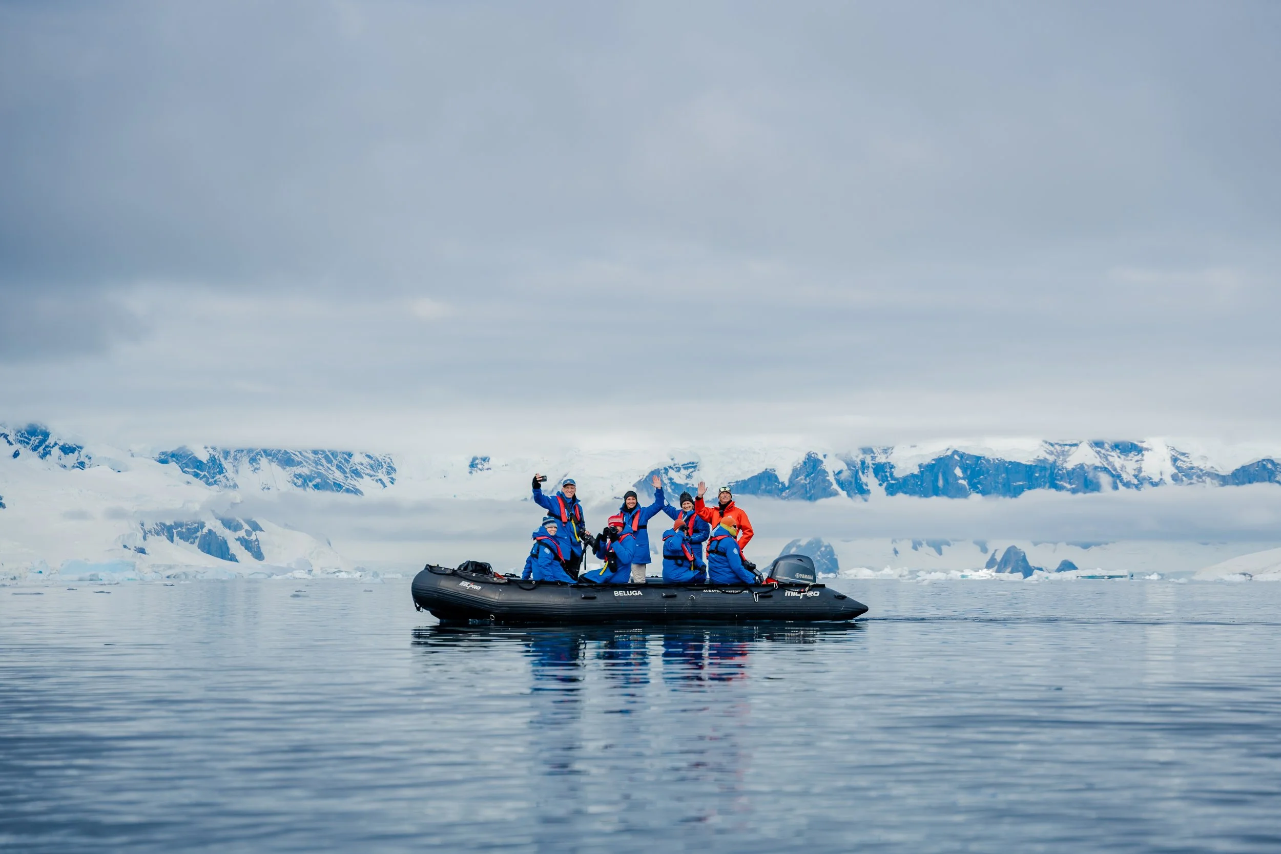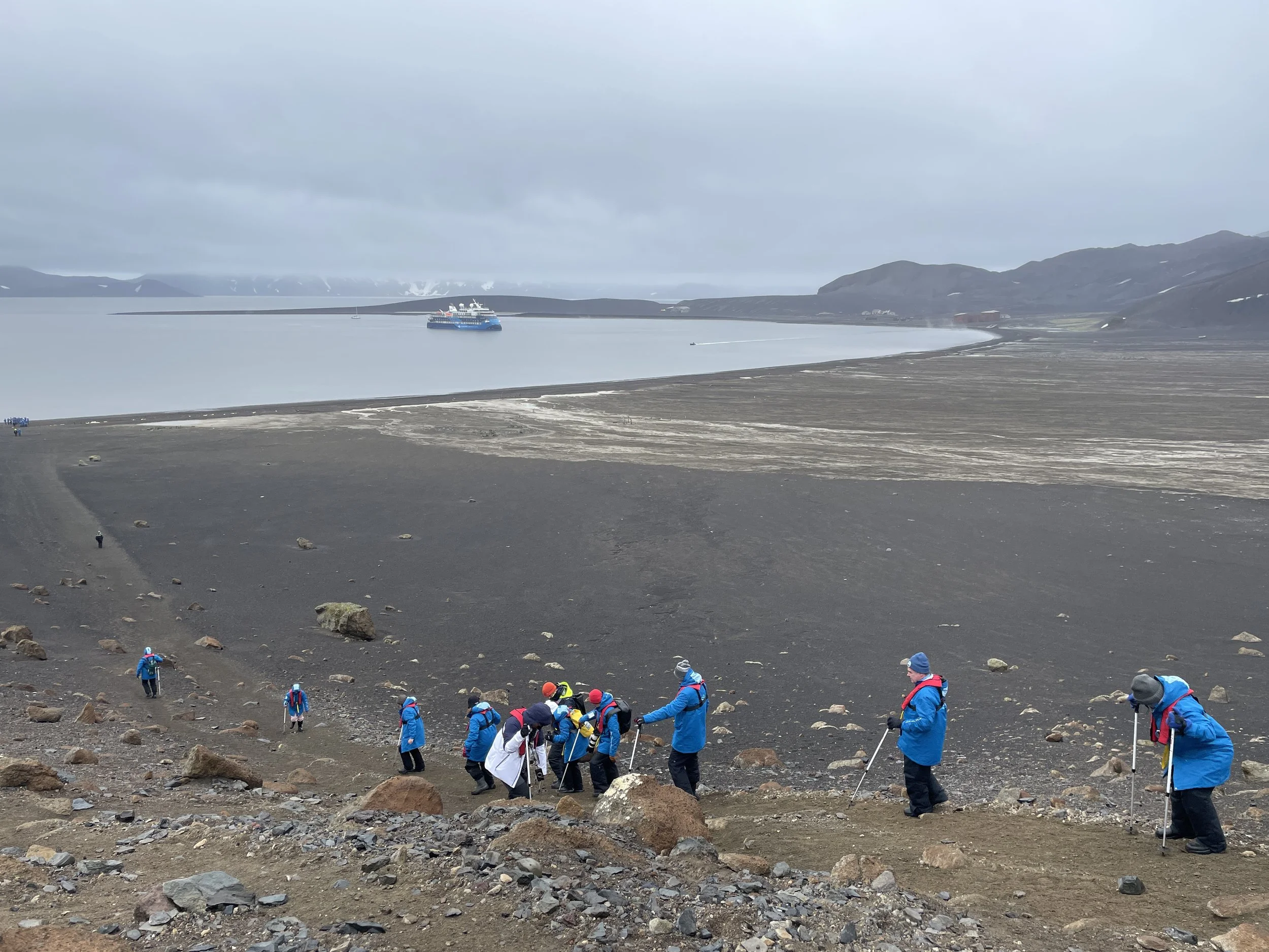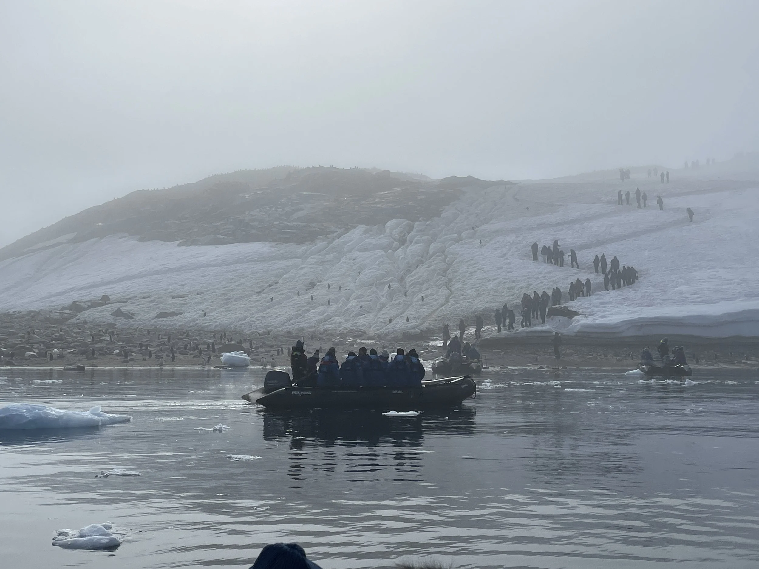 Zodiac waiting to land and disembark its passenger. The people on shore could hike up to the top and some are returning to the zodiacs