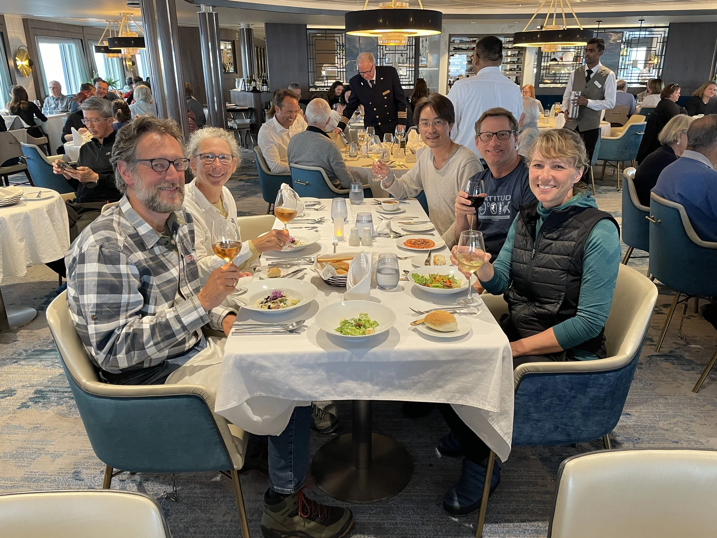 Our cruise offered 3 meals a day, wine was included with dinner. There was a bar open during the other times of day. Our ship also had a 24/7 coffee and tea station. Breakfast was buffet style with a make-your-own omelet station. The cuisine was diversified with gluten free options, vegan options, kosher options, etc. We had a fish option, a red meat option and vegetarian option every meal every day. Salads and fruit were also available with every meal and the deserts were incredible. We had buffet dinner the first night after onboarding and buffet style lunches every day. Dinners were served with choices off a menu and served to you at a group table. Room service was also an option. One day it was so nice outside, we had a BBQ on the upper deck outside.